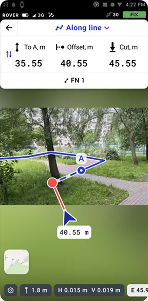 Du sparer tid, fordi din afsætning kan udføres direkte i Augmented Reality, som viser dig på skærmen hvor punkter og linjer er placeret. Derved skal du ikke længere lede rundt med GPS-staven for at finde den linje eller det punkt du skal afsætte.